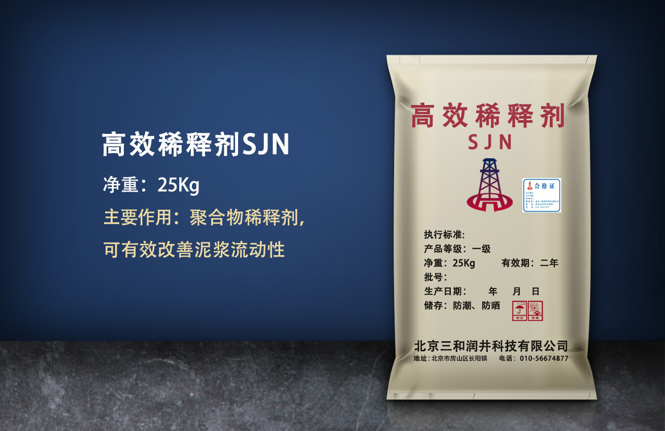 高效稀释剂(SJN)是由阴离子单体、阳离子单体等多种有机单体为主,辅以其它有机物质经共聚和缩合反应制取的钻井液用稀释剂,其外观是白色自由流动粉末。
